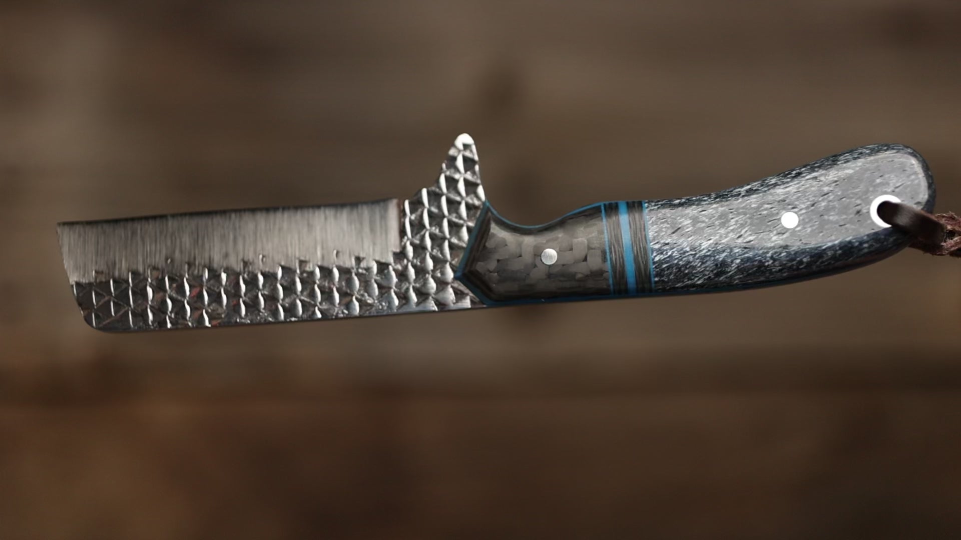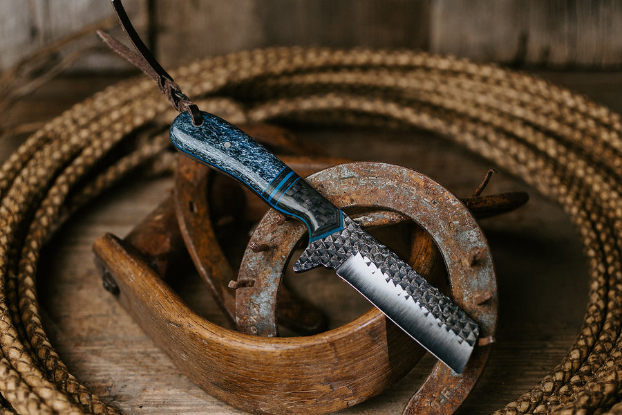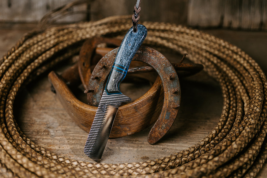 This Bull Cutter is all business. The blade’s built from a farrier’s rasp—steel made to take abuse and keep its bite. You can still see the pattern of the rasp, proof it’s lived a working life. The handle pairs carbon fiber with polished giraffe bone, bringing together grit and class. A carbon fiber and blue G10 spacer ties the look together, with blue G10 liners adding a quiet flash. At 7¼ inches overall, it’s compact, balanced, and built for steady hands. Strong, clean, and meant for everyday use, not display cases.