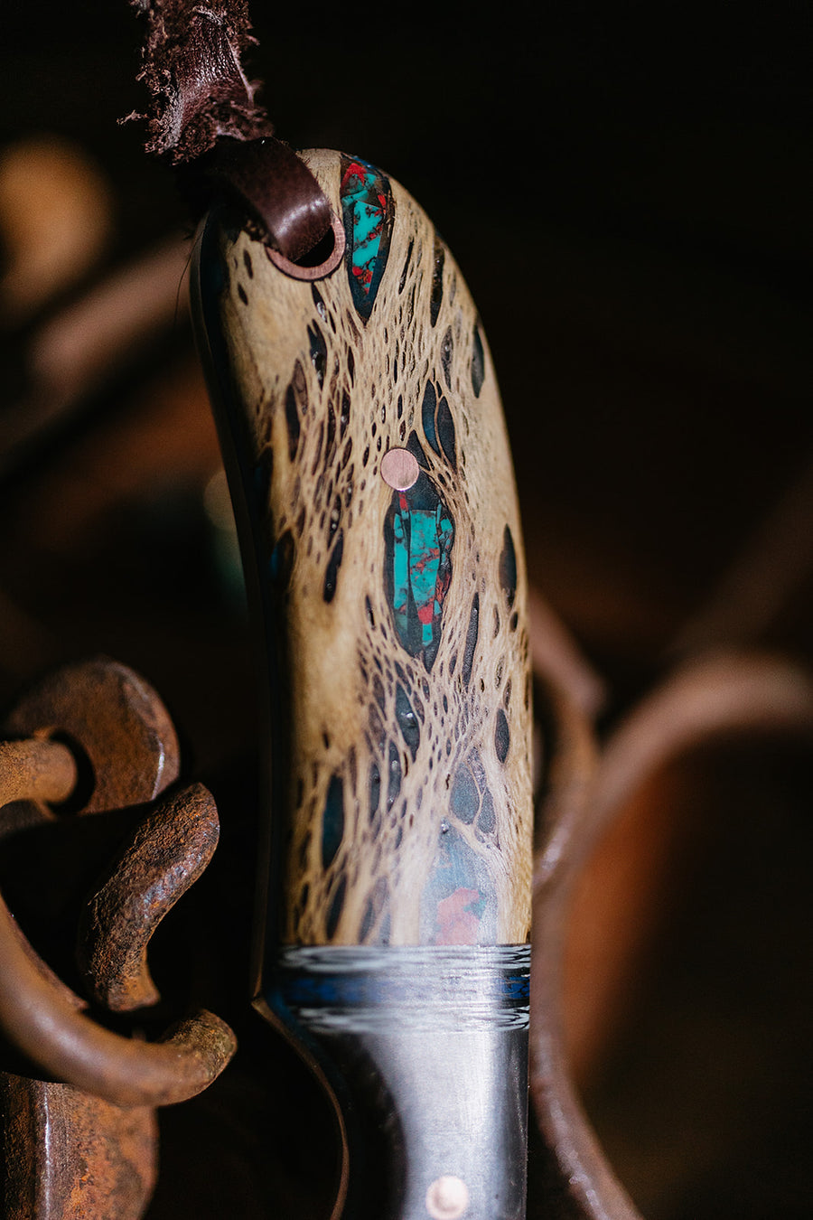The handle is dark gray Juma with a carbon fiber spacer, broken up by cholla cactus with Sonoran TruStone inlay. There’s texture there, but it stays controlled in the hand. Nothing flashy. Just enough contrast to remind you it didn’t come off a shelf.