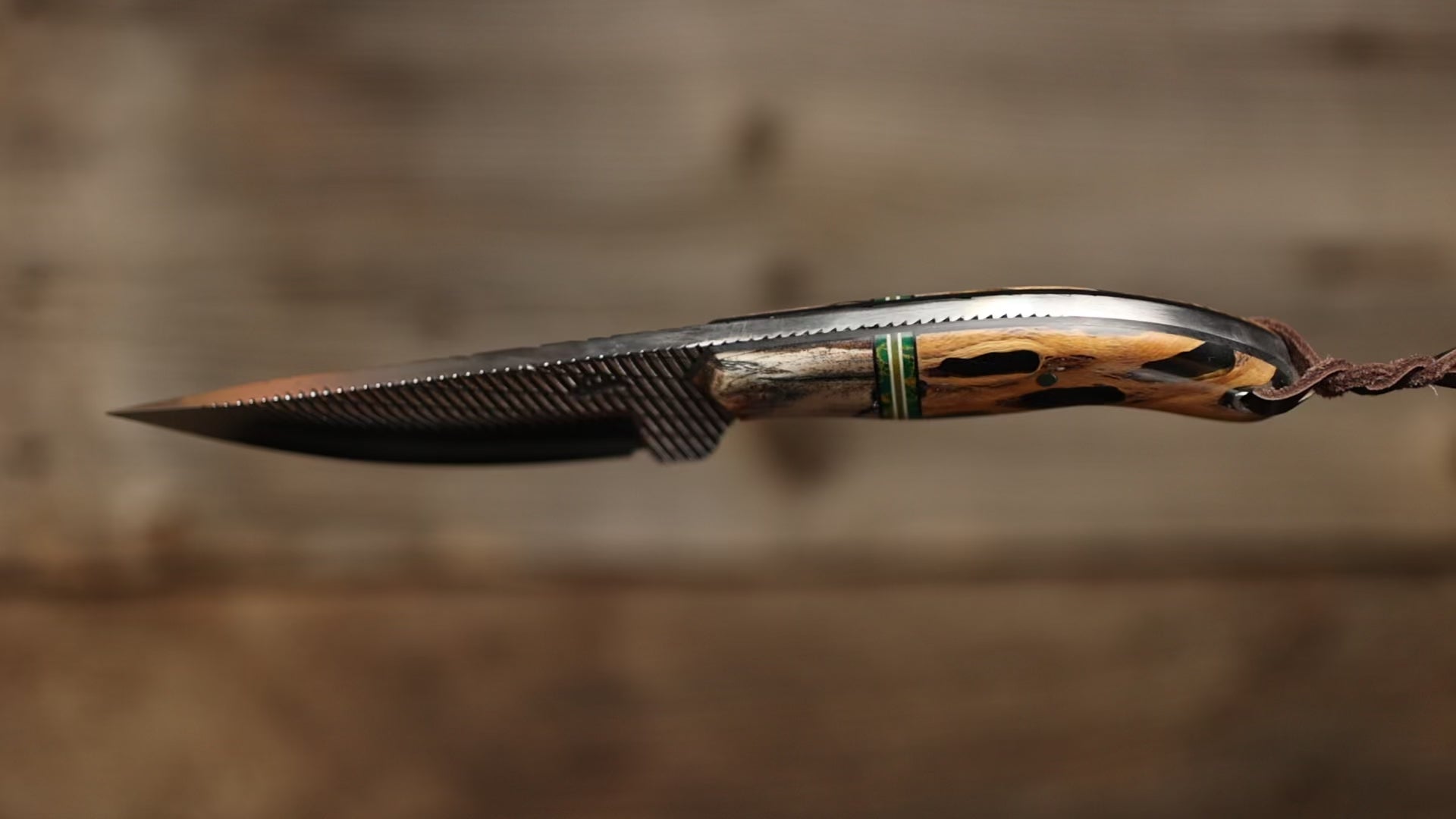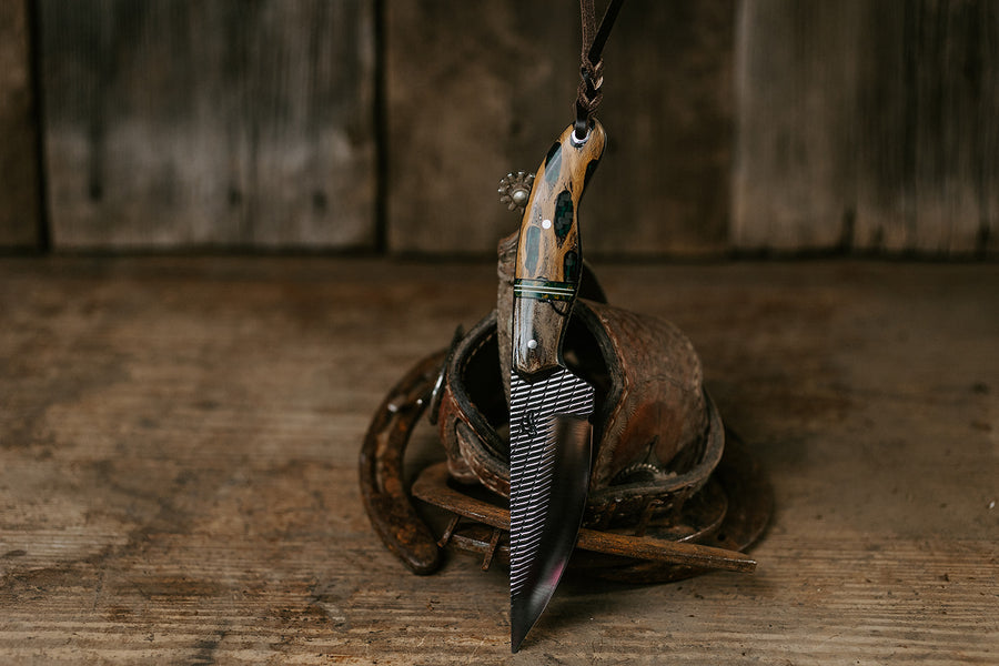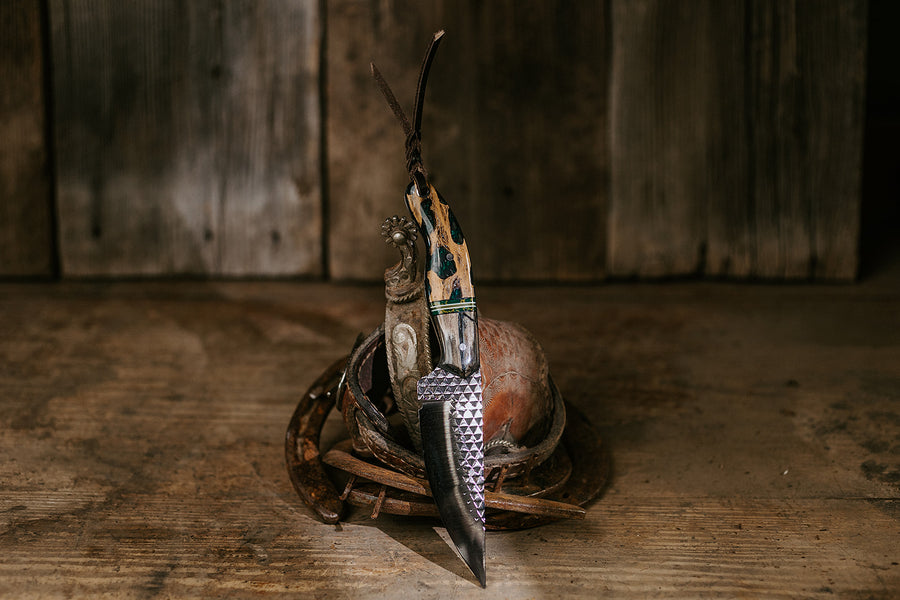 The Saddletramp rides the line between hard use and fine craft. Built from a farrier’s rasp, it’s got that working edge that doesn’t quit. Every line on the blade tells the story of metal once used to shoe horses, now turned toward something sharper. The handle’s a mix of desert grit and old-world polish—cholla cactus packed with green resin and black carbon fiber, tied together with a glow-in-the-dark spacer and capped with mammoth bone. It’s a knife meant for the kind of hands that don’t mind putting in miles.