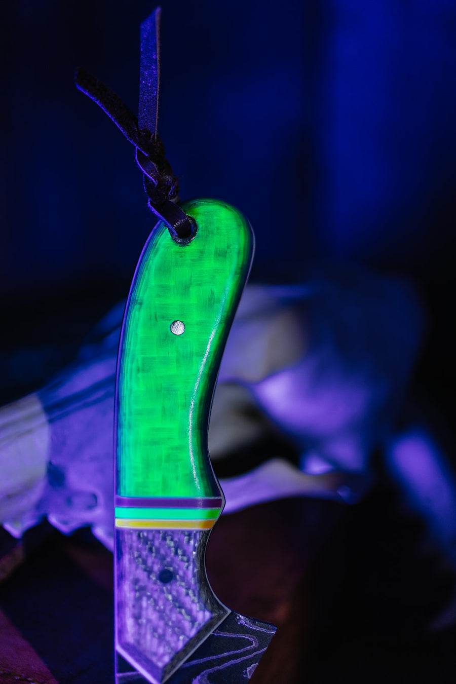 The handle is where this knife decides to have some fun. Silver carbon fiber paired with glow carbon fiber and a glow spacer that actually earns its keep in low light. It lights up without feeling like a gimmick. G10 liners and accents keep everything locked down and honest. I shape every handle by hand so it fills the grip instead of fighting it.