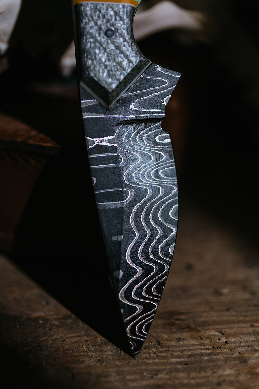 The First Light is what happens when I stop pretending everything has to look serious to work hard. It’s a Maverick pattern with a tight, controllable edge and a long enough handle to stay planted when you lean into it. The blade is low-layer pattern weld in 15N20 and 80CRV2. That combo gives you contrast, toughness, and an edge that doesn’t flinch when you ask something of it.