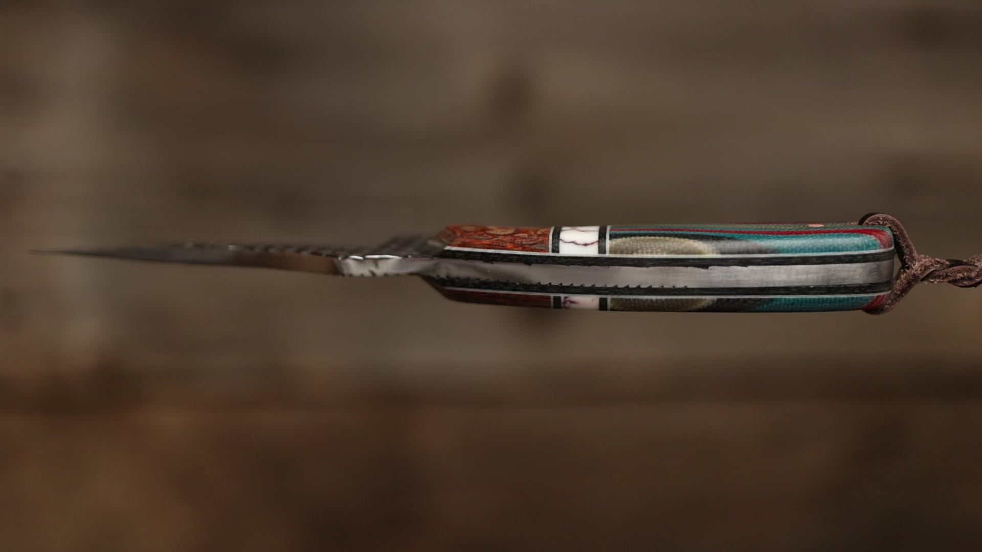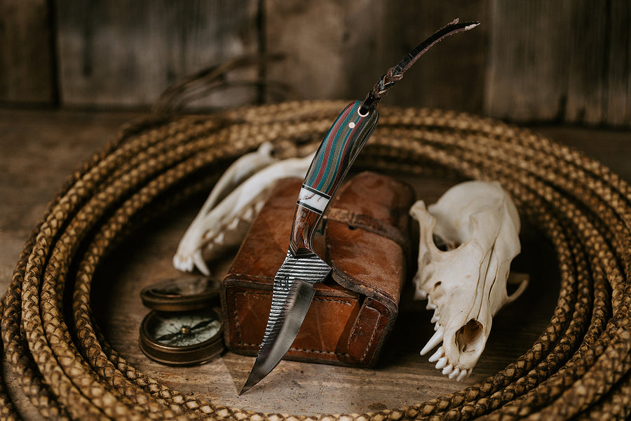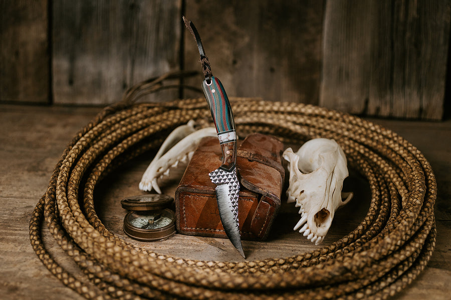 The Coyote Caper has a wild streak, but it’s built to work. The blade’s built from a farrier’s rasp, the kind of steel that’s seen a lifetime of sparks and grit. Its textured finish keeps that story alive. The handle’s Navajo Blanket pattern runs with color and grain, tied together with a white TruStone spacer, black and white G10 liners, and a strip of leopard wood that warms it up. At 7¼ inches overall, it’s light in hand but steady in use. Built for folks who move fast, think sharp, and like tools with character.