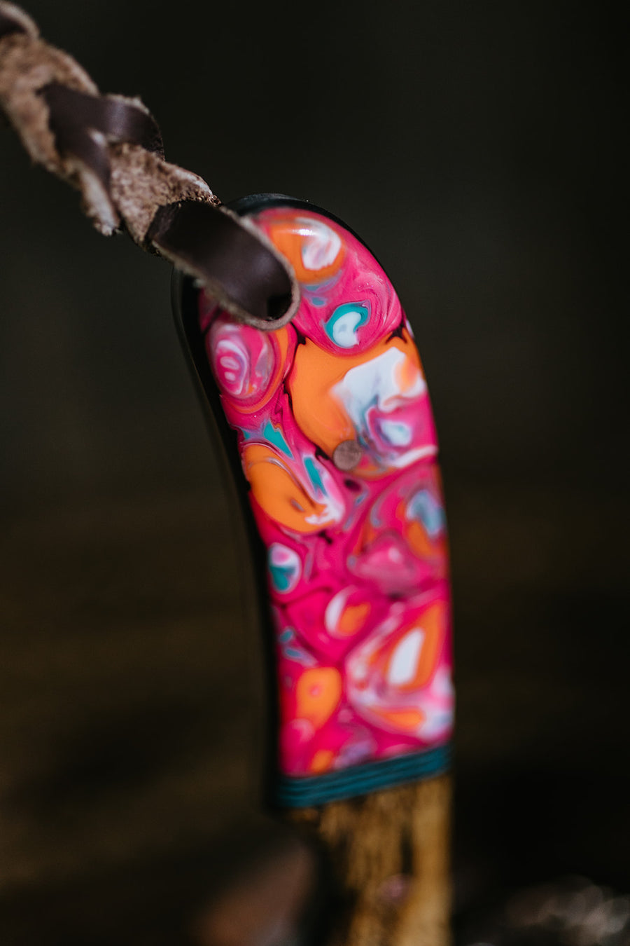 The handle is multi color neon resin with a carbon fiber spacer and a cholla cactus bolster. It’s loud, but it’s not sloppy. The pattern has flow, the cholla adds texture, and everything stays locked together with G10 liners and accents. I shape every handle by hand so it sits right, even when your grip shifts.